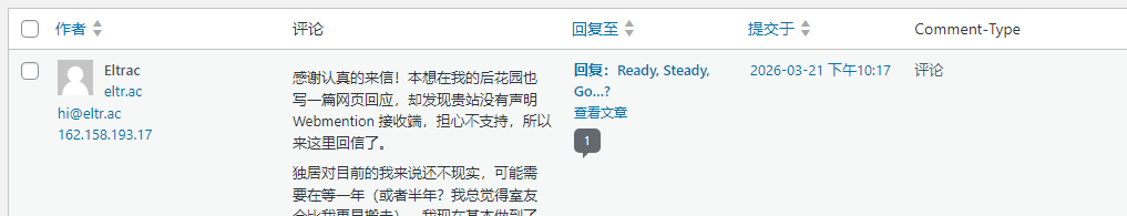 记得WordPress的Webmention插件会在评论系统注册一种名为「Comment-Type」的评论类型的字样,从而区分开普通评论、Webmention的区别。